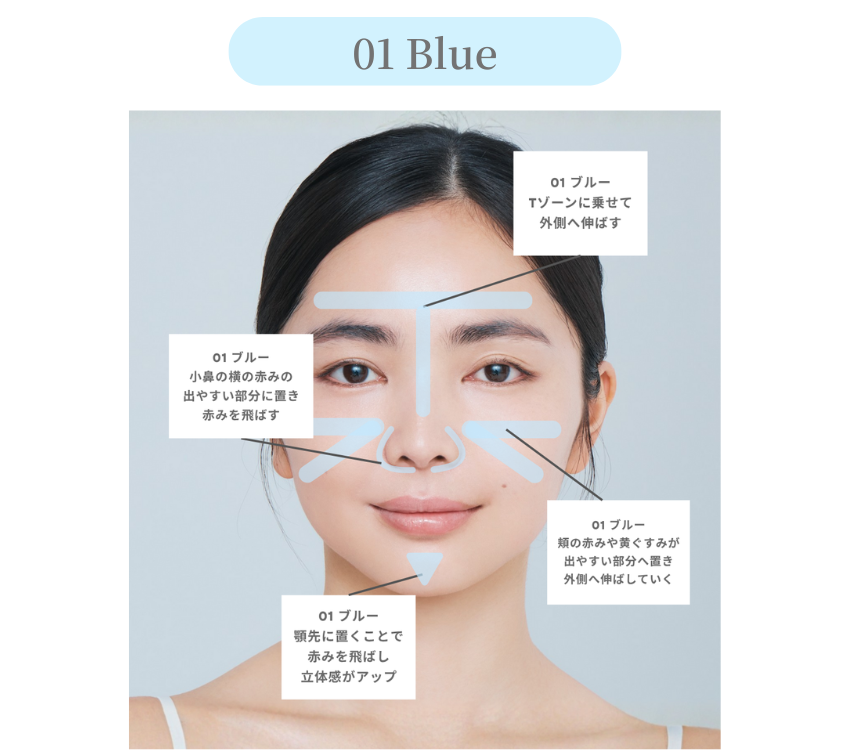 下地として顔全体、もしくは黄ぐすみや赤みなど気になるところにチップでのせて、指で伸ばし優しくなじませます。